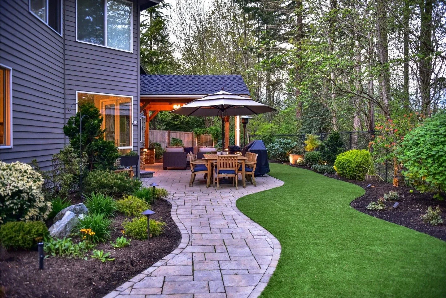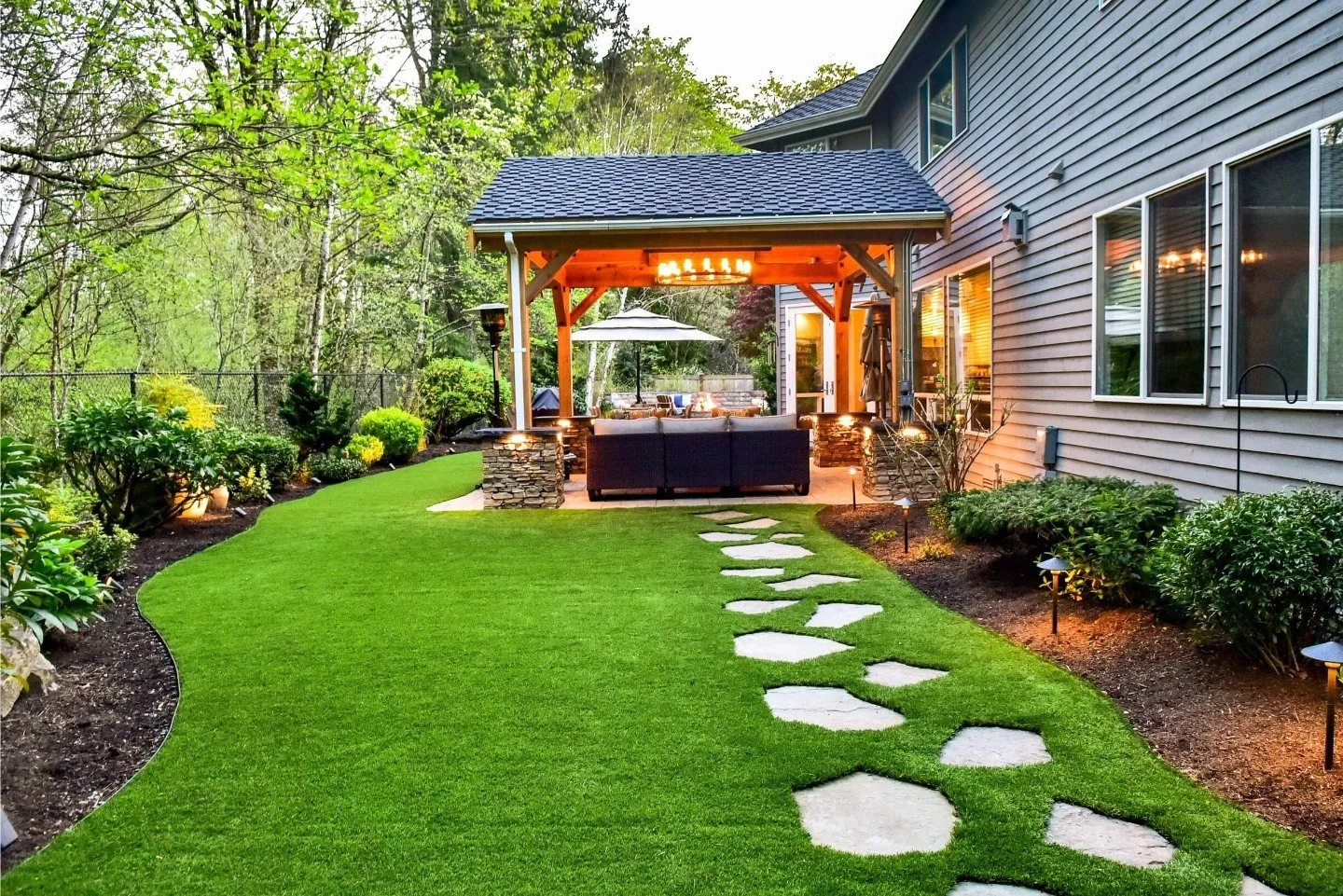 Nestled between a wooded area and a beautiful home, this backyard offers versatility throughout the seasons. A wood pavilion with natural stone bases around the columns and a rustic chandelier hanging from the beams creates the perfect transition from the home to the outdoors. This also provides shelter for the paver patio area so the homeowner can spend time outside no matter the weather. A winding paver walkway leads to a cozy fire pit space featuring a built-in seating wall and paver patio. Then a natural stone offers a whimsical route from the pavilion to the lush green lawn. Outdoor lighting adds ambiance every evening.